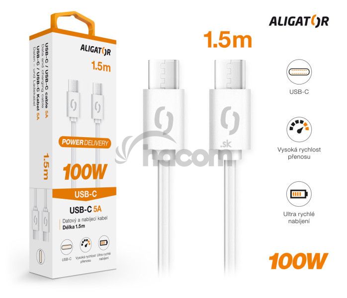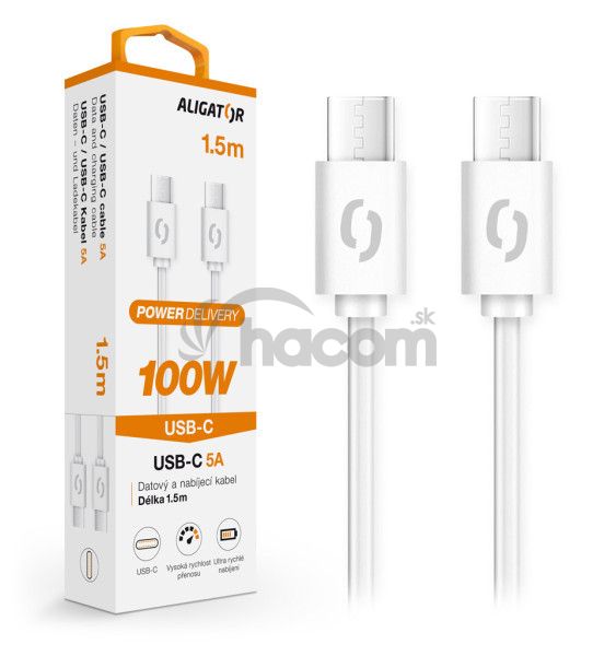 - Dátový kábel ALIGATOR POWER 100W, USB-C/USB-C 5A, 1,5m biely DATKP47