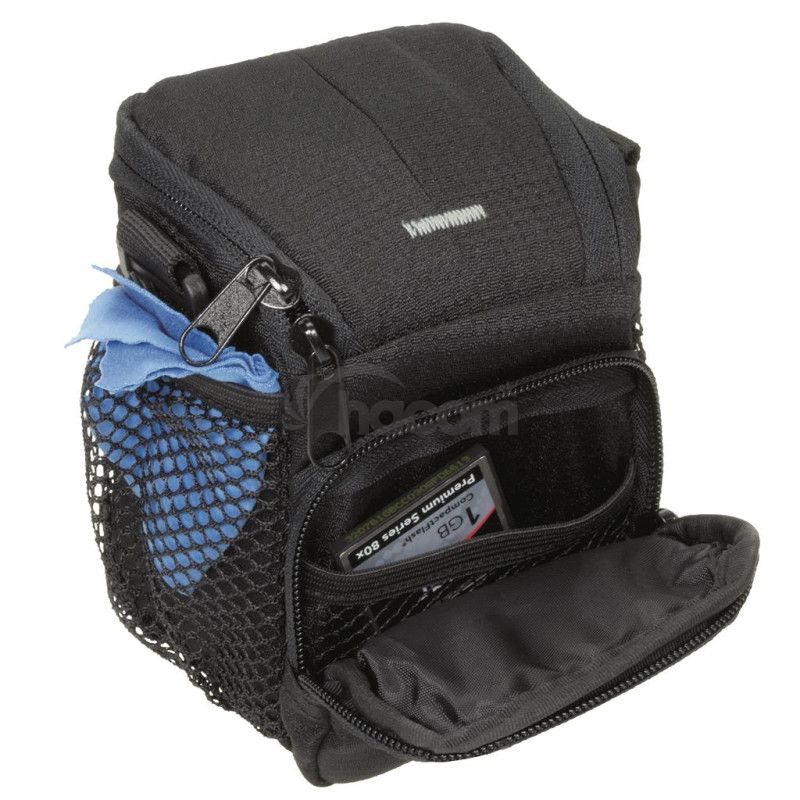 Fototaška na kompaktné systémové fotoaparáty alebo malé videokamery s remeňom cez rameno. Horný prístup s odklápaním od tela, veľké predné a sieťované bočné / vnútorné vrecká, čierny mäkký interiér proti poškriabaniu, vnútorné rozmery 10x12x7 cm, farba čierna. Rad ACTION Black vyniká kvalitným spracovaním a nadčasovým designom. Pri zachovaní veľmi priaznivej ceny je použitý príjemný čierny povrchový materiál s jemnou štruktúrou doplnený elegantnou šedou vsadkou.