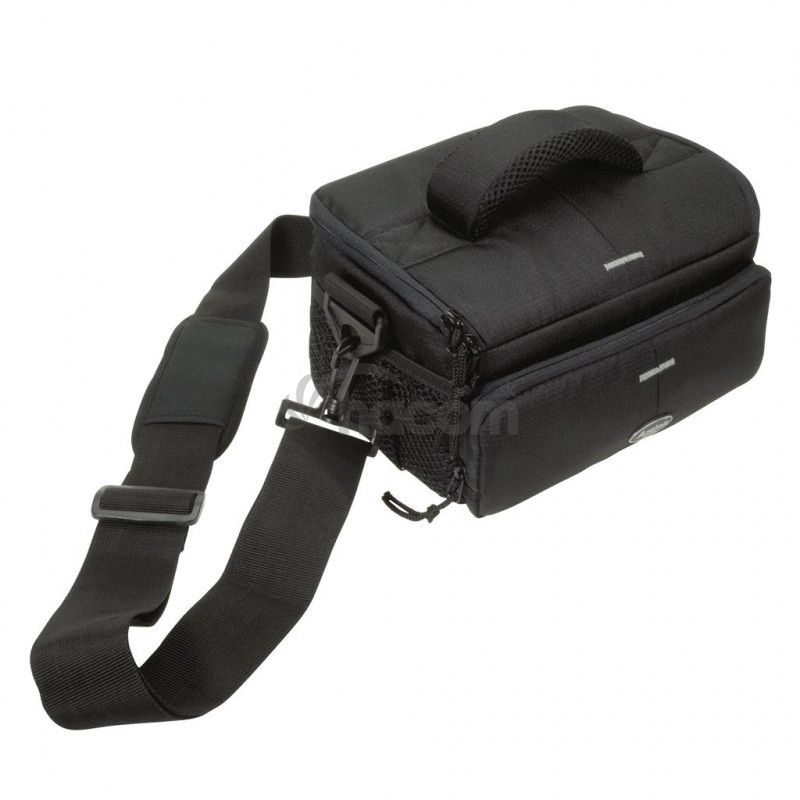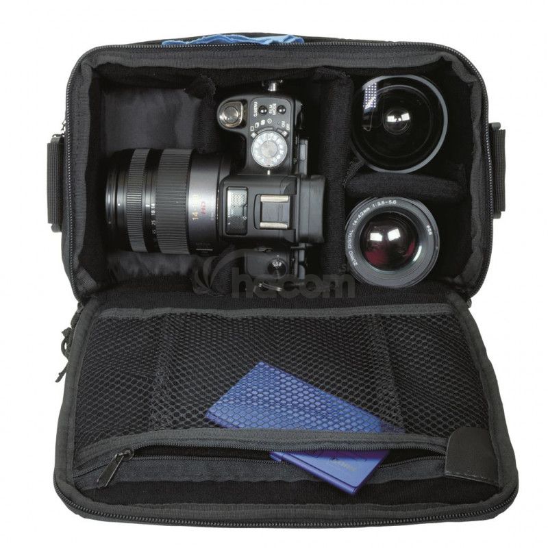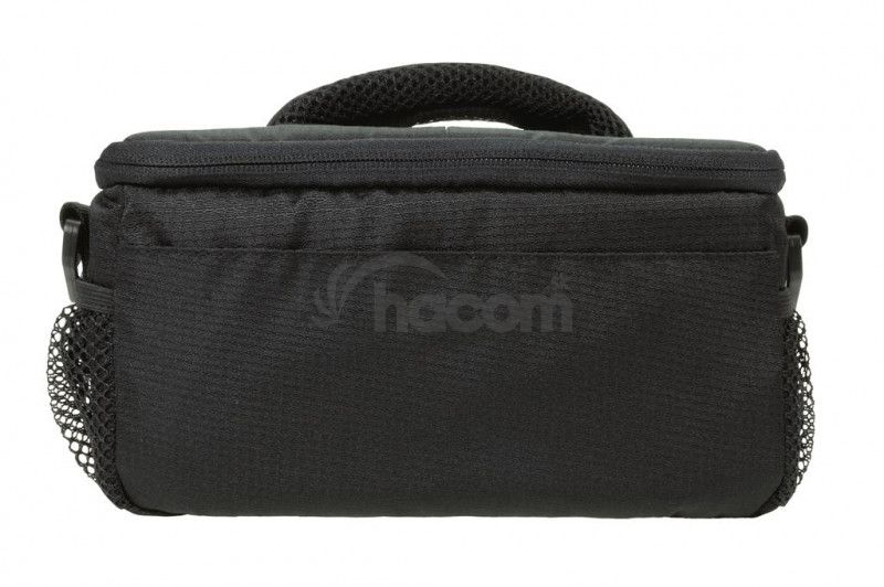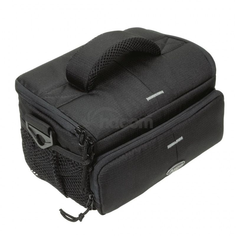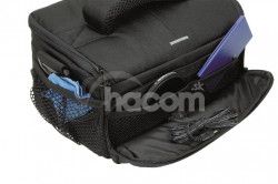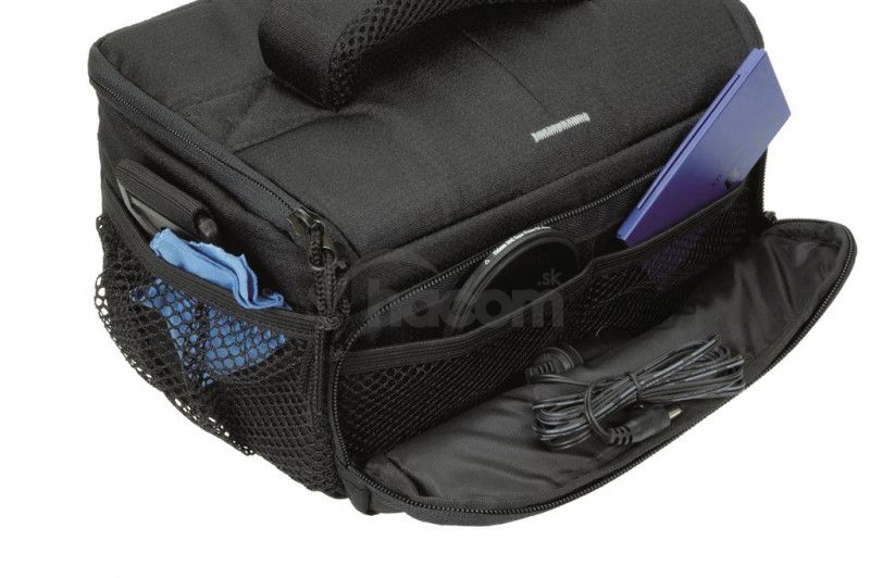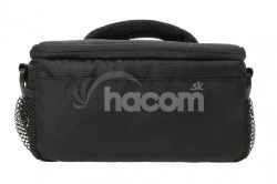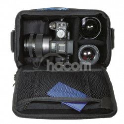 Fototaška na zrkadlovky alebo videokamery (+ príslušenstvo) s mäkkým polstrovaným uchom a remeňom cez rameno. Horný prístup s odklápaním od tela, veľké predné a bočné vrecká, sieťované vnútorné vrecká, čierny variabilný interiér - mäkký proti poškriabaniu, vnútorné rozmery 25x13x16 cm, farba čierna. Rad ACTION Black vyniká kvalitným spracovaním a nadčasovým designom. Pri zachovaní veľmi priaznivej ceny je použitý príjemný čierny povrchový materiál s jemnou štruktúrou doplnený elegantnou šedou vsadkou.