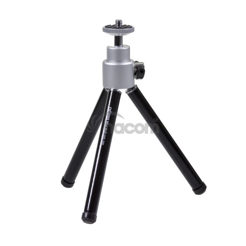 Stolný teleskopický ministatív s guľovou hlavou, minimálne rozmery, kovová konštrukcia, nízka hmotnosť vďaka použitiu hliníka, výška 15-20,5 cm, hmotnosť 110 g, čierny/strieborný.Parametre