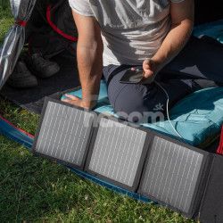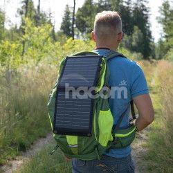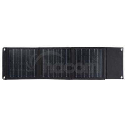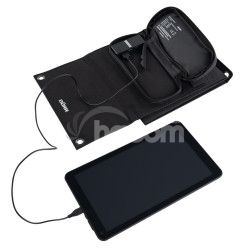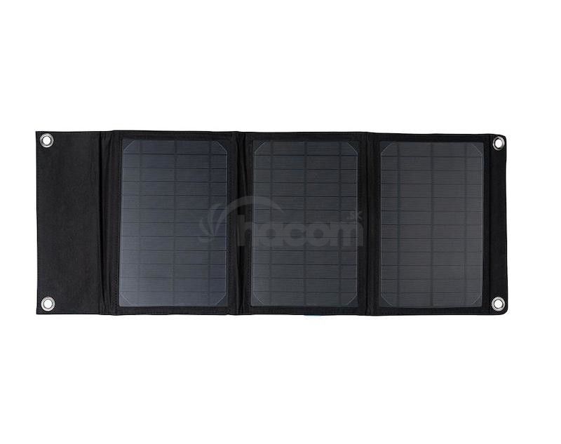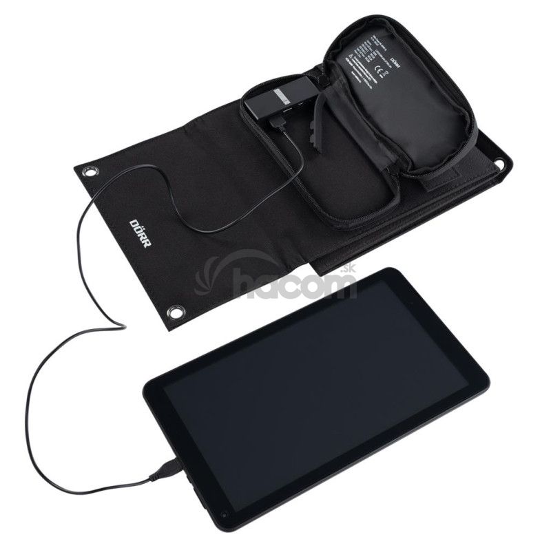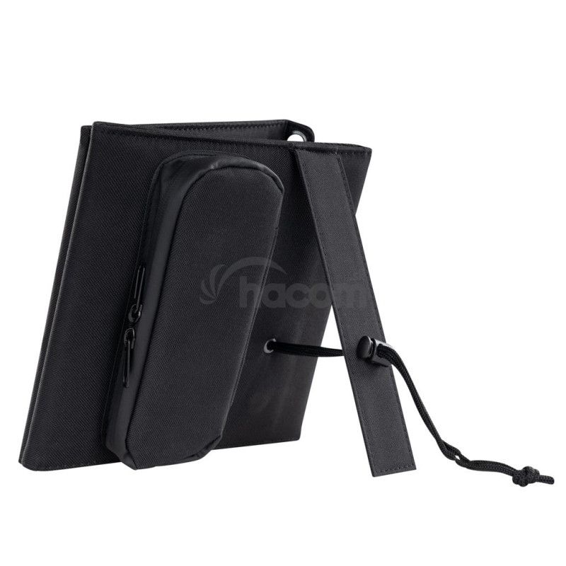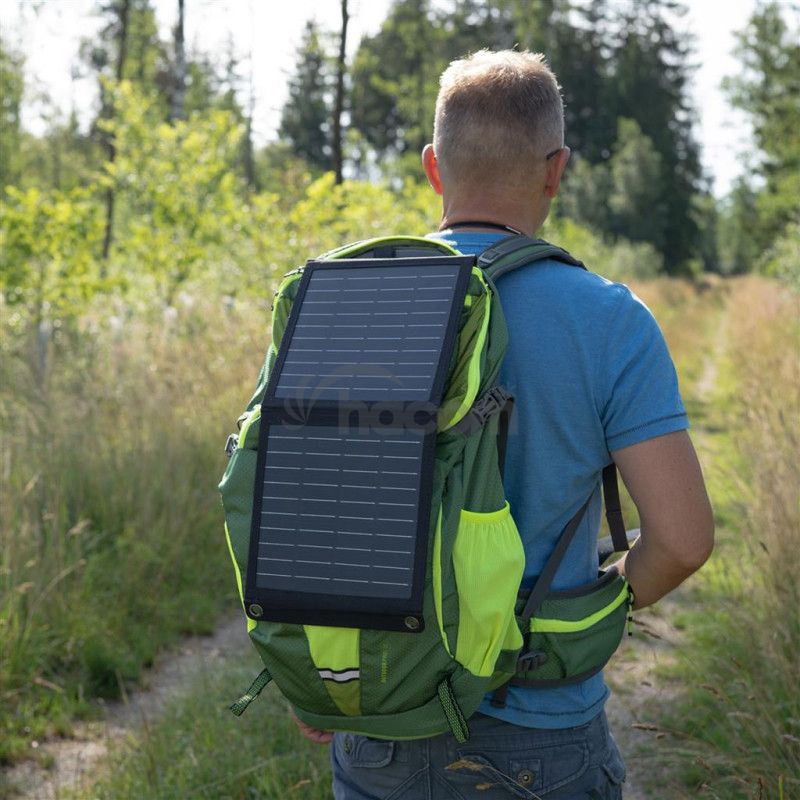 Mobilné outdoor výkonný solárny panel (5,5V / 12W) a nabíjací POWERBANK / externý Li-Pol akumulátor 10000mAh / 5V vo skladacím textilnom puzdre, 2x USB výstup (5V / 2,4A) - aj súčasne. Za optimálnych svetelných podmienok nabitie priadnom akumulátora za 4h. Nemožno nabíjať z PC. Odolný textilný materiál pre vonkajšie použitie s vnútorným vreckom pre nabíjané zariadenie. Vhodné pre nabitie mobilných telefónov, MP3 prehrávačov, tabletov, navigáciou, fotoaparátov ... Veľká kovové oká a opora pre umiestnenie v outdoor podmienkach. Ochrana proti skratu a prebitiu, nízke samovibíjení, automatické odpojenie po ukončení nabíjania, LED kontrola nabíjania a zostávajúcej kapacity, rozmery v zloženom stave 155x260x40mm, rozložený 400x260x30mm, hmotnosť 615g. Súčasťou dodávky je USB / Micro USB kábel.
