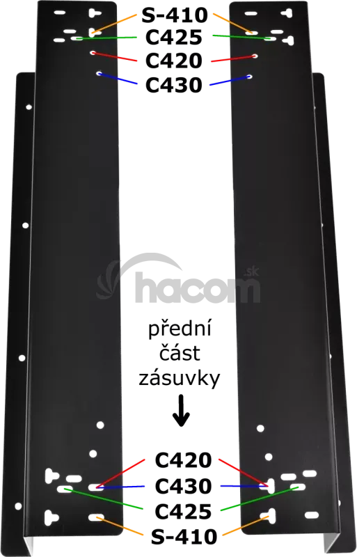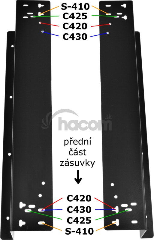 Súprava dvoch kusov držiakov na zavesenie pokladničných zásuviek Virtuos C420x, C425 a C430x pod pracovnú dosku alebo predajný pult, vrátane sady skrutiek* Robustný držiak na upevnenie pokladničnej zásuvky pod pracovnú dosku alebo pokladničný pult