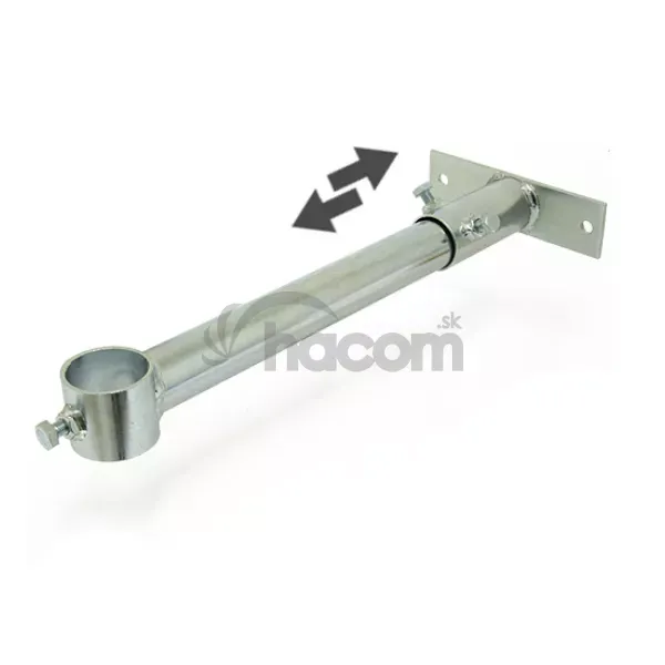 Držiak výsuvný pre stožiar o priemere 48 mm s jednou zaisťovacou skrutkou stožiaru a dvoma zaisťovacími skrutkami pre zabezpečenie vysúvanej časti s odsadením 410 až 470 mm od steny či krovu a možnosťou natočenia.