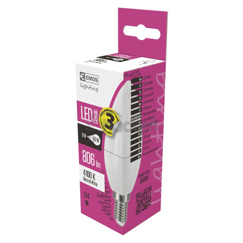 EMOS žiarovku ZQ3231 naskrutkujete vďaka pätici E14 takmer do všetkých lampičiek vo vašej domácnosti. Okrem vysokého svetelného toku (806 lm) vás poteší aj svojou nízkou spotrebou (len 8 W) a výnimočne dlhou životnosťou 30 000 hodín.