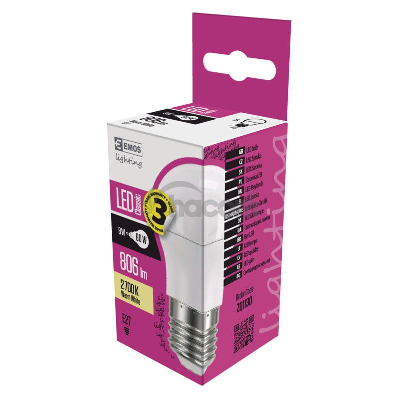 EMOS žiarovku ZQ1130 naskrutkujete vďaka pätici E27 takmer do všetkých lustrov, lámp a svietidiel vo vašej domácnosti. Okrem vysokého svetelného toku (806 lm) vás poteší aj svojou nízkou spotrebou (len 8 W) a výnimočne dlhou životnosťou 30 000 hodín.