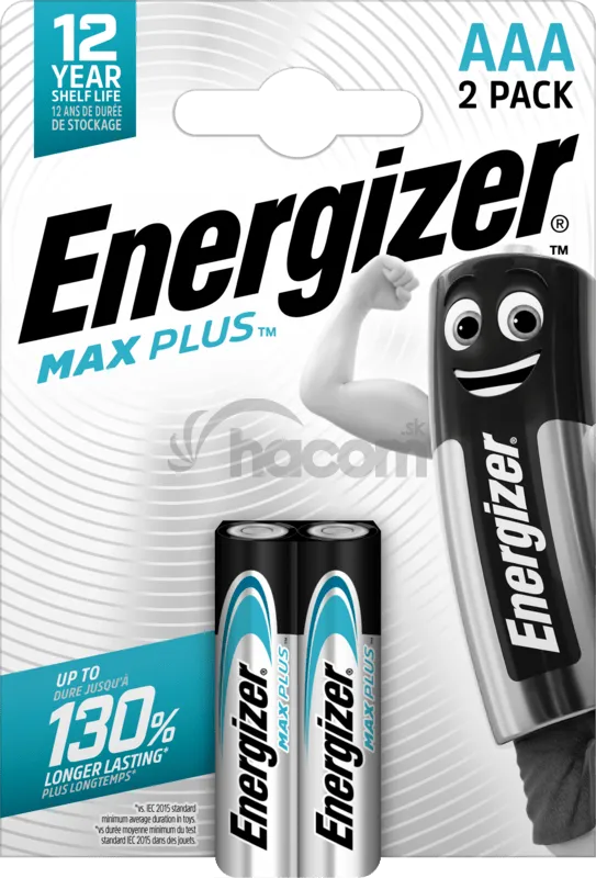 Alkalické jednorázové batérie Energizer MAX Plus AAA/LR03 s max výkonom pre Hi-Tech použitie a do spotrebičov s vyšším odberom energie (digitálne fotoaparáty). S extra dlhou životnosťou, neobsahujú kadmium ani meď. Odolávajú teplotám od -18 °C po +55 °C.