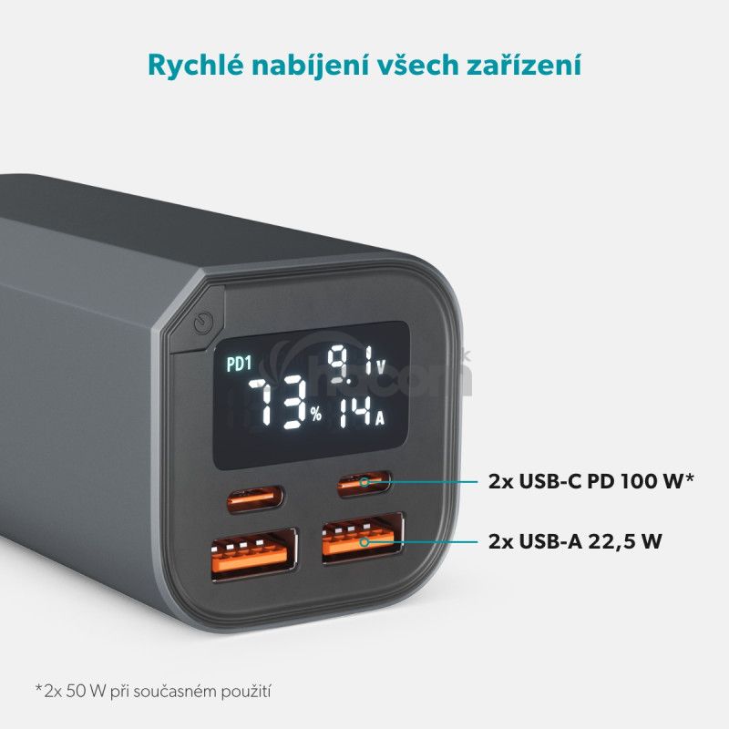 USB-C výstupy: Dva USB-C porty s výkonom až 100 W samostatne (50 W každý pri súčasnom použití), vhodné pre energeticky náročné zariadenia.