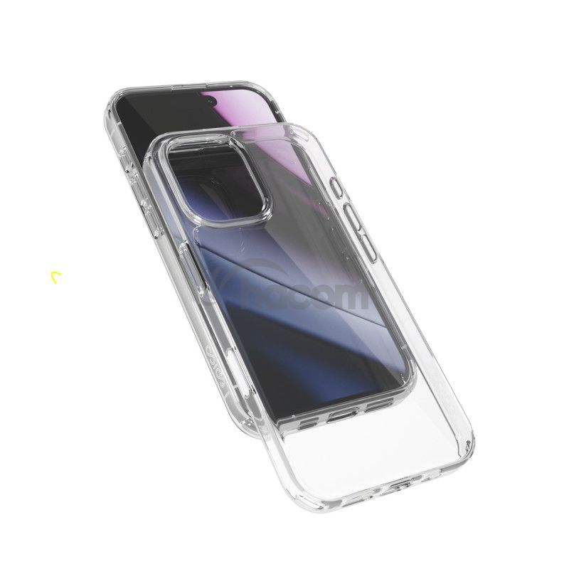 Kryt je vybavený integrovaným Camera Control tlačidlom, ktoré zachováva plnú funkčnosť ovládania fotoaparátu. Vyvýšené hrany a rámček okolo šošoviek chránia najcitlivejšie časti telefónu. Priehľadný chrbát je vyrobený z materiálu, ktorý odoláva UV žiareniu a bráni zožltnutiu aj pri dlhodobom používaní.