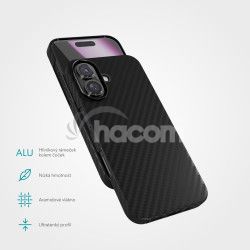 Kryt na telefón, pre Apple iPhone 16 Plus, kompatibilný s MagSafe, materiál aramidové vlákno, hliníkový rámček okolo objektívov, farba čierna.Odolné aramidové vlákno MagSafe kompatibilné: Kompatibilita s MagSafe zaručuje bezdrôtové nabíjanie bez prerušenia.