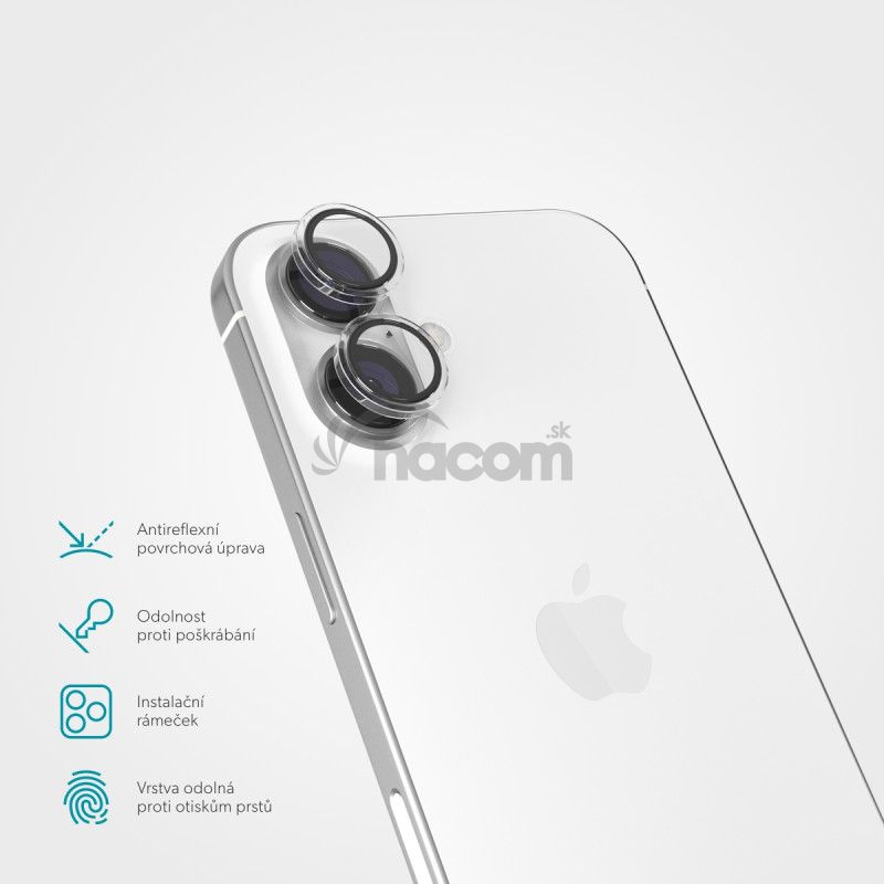 Ochrana pre šošovky fotoaparátu, pre Apple iPhone 16/16 Plus, tvrdené sklo, tvrdosť 9H, súčasťou: inštalačný rámček.Praktická ochrana objektívov s antireflexnou povrchovou úpravou