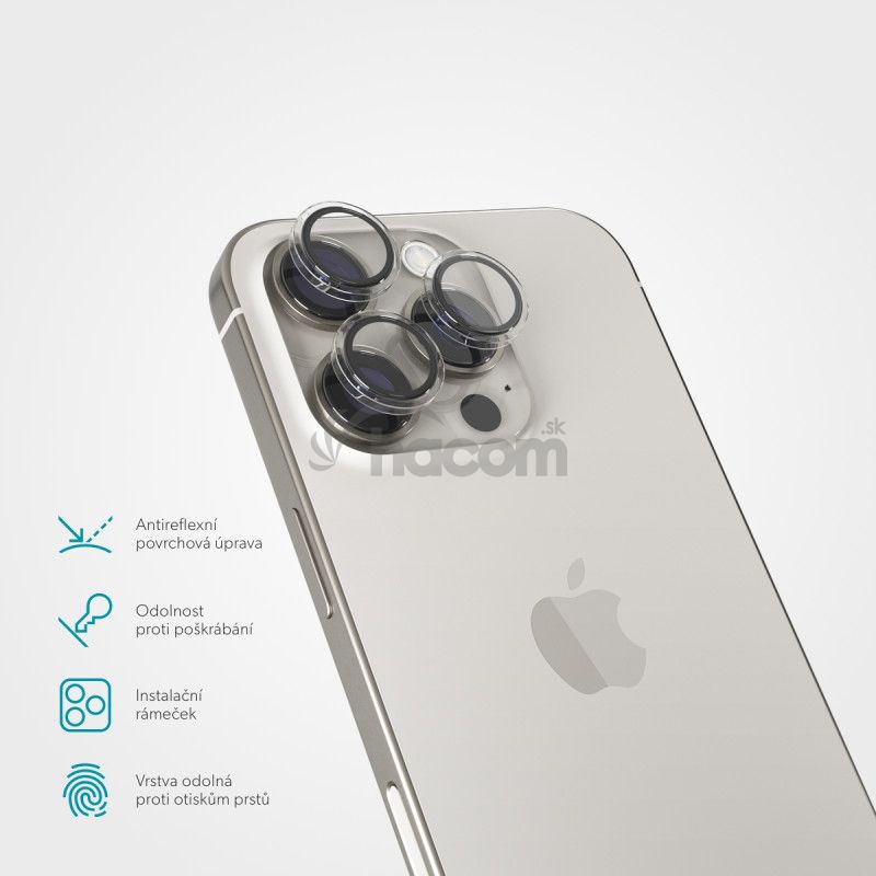 Ochrana pre šošovky fotoaparátu, pre Apple iPhone 16 Pro/16 Pro Max, tvrdené sklo, tvrdosť 9H, súčasťou: inštalačný rámček.Praktická ochrana objektívov s antireflexnou povrchovou úpravou