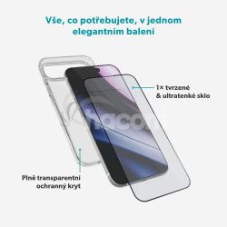 Priehľadná zadná strana krytu s UV ochranou zabraňuje zožltnutiu a zachováva pôvodný vzhľad iPhonu. Ochranné sklo kryje displej od kraja k kraju as hrúbkou 0,33 mm v kombinácii s tvrdosťou 9H ho spolehlivo chráni bez toho, aby znižovalo citlivosť dotyku alebo ostrosť obrazu. Špeciálna vrstva proti odtlačkom prstov zároveň udržuje povrch displeja čistý a bez šmúh. Štíhle prevedenie krytu a hladké 2,5D hrany skla zaručujú, že váš iPhone působí elegantne a príjemne padne do ruky. Pružný rámček krytu a jednokrokový aplikátor skla uľahčujú inštaláciu, takže všetko zvládnete rýchlo a ľahko.