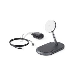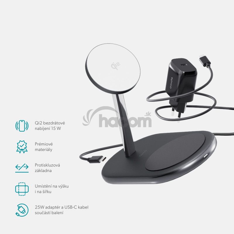 Qi2 bezdrôtová nabíjačka 2v1, 15 W bezdrôtový výstup pre iPhone aj Android, nabíjacia základňa 5 W, 25 W adaptér a USB-C kábel v balení, farba čierna.Bezproblémové nabíjanie s prepracovaným designom Elegantný design: Vyrobené z prémiových materiálov, ktoré z tejto nabíjačky robia krásny doplnok na váš stôl. Certifikácia Qi2 & kompatibilita s MagSafe. Užite si až 2x rýchlejšie bezdrôtové Qi2 nabíjanie pre iPhone (15W) s magnetickým uchytením. 2v1 nabíjanie: Umožňuje súčasné nabíjanie smartphonu a AirPods (5W). Stabilná gumová základňa: Vybavená protišmykovou gumovou základňou pre lepšiu stabilitu. Flexibilné umiestnenie: Podporuje umiestnenie smartfónu na výšku aj na šírku.