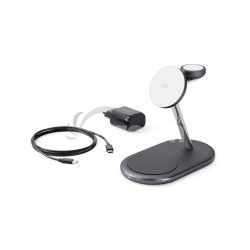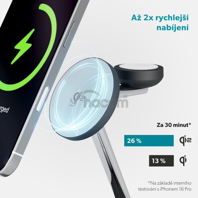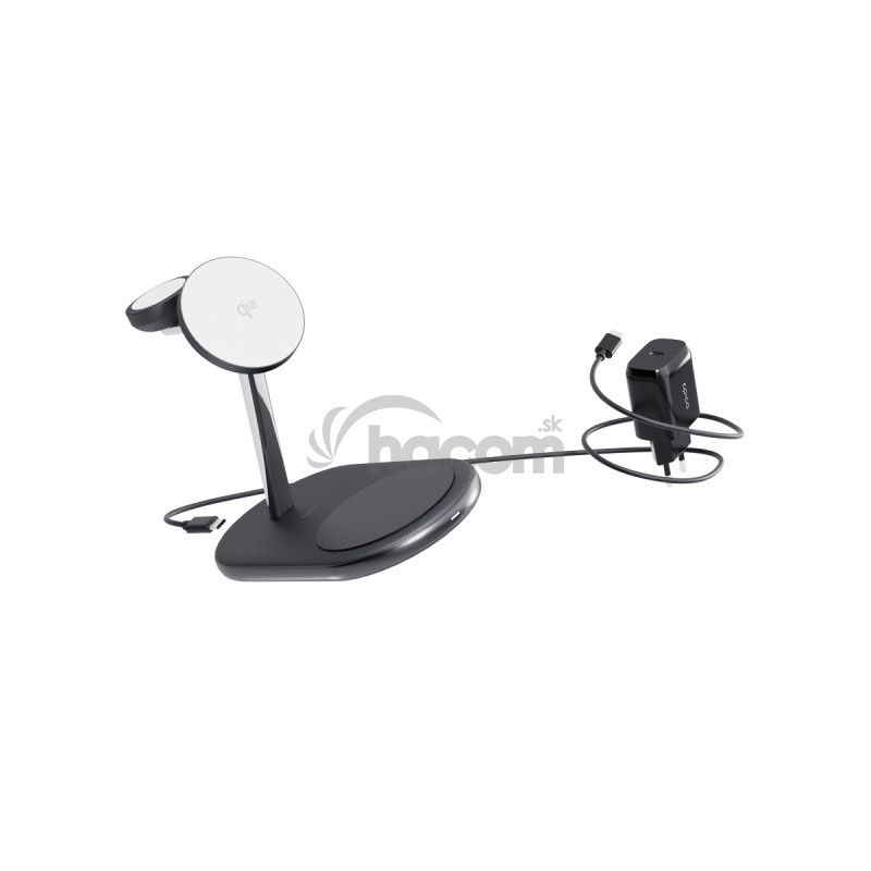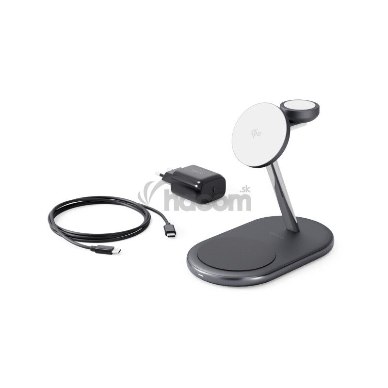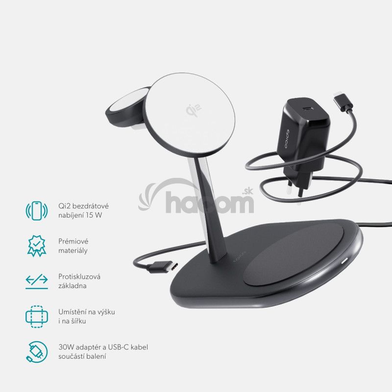 Qi2 bezdrôtová nabíjačka 3v1, 15 W bezdrôtový výstup pre iPhone aj Android, nabíjacia základňa 5 W, modul pre Apple Watch 3 W/5 W, 30 W adaptér a USB-C kábel v balení, farba čierna.Krásne spracované riešenie pre všetky vaše potreby nabíjania. Elegantný dizajn: Vyrobené z prémiových materiálov, ktoré z tejto nabíjačky robia krásny doplnok na váš stôl. Certifikácia Qi2 & kompatibilita s MagSafe. Užite si až 2x rýchlejšie bezdrôtové Qi2 nabíjanie pre iPhone (15W) s pevným magnetickým uchytením. 3v1 nabíjanie: Nabíjajte súčasne smartfón, Apple Watch (5W) aj AirPods (5W). Certifikácia Made for Apple Watch: Certifikované spoločnosťou Apple pre zaistenie plnej kompatibility s budúcimi aktualizáciami a bezchybný výkon Stabilná gumová základňa: Vybavená protišmykovou gumovou základňou pre lepšiu stabilitu. Flexibilné umiestnenie: Podporuje umiestnenie smartfónu na výšku aj na šírku.