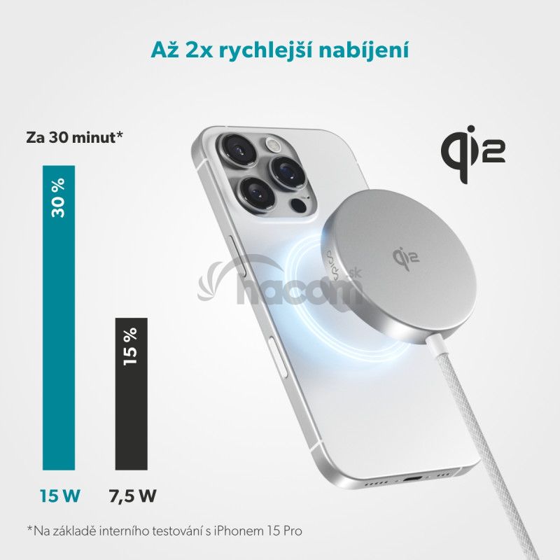 Bezdrôtová nabíjačka, certifikácia Qi2, podpora MagSafe, výkon 15W, integrovaný 1,2m kábel USB-C. Rýchle a bezpečné nabíjanie s Qi2 Certifikácia Qi2 & kompatibilita s MagSafeUžite si rýchle 15W bezdrôtové nabíjanie vďaka technológii Qi2 aj pre iPhony. Nabíjajte až 2× rýchlejšie ako s bežnými Qi nabíjačkami. Silný magnet: Udrží váš telefón bezpečne na mieste a zároveň umožní pohodlné používanie bez prerušenia nabíjania. Hliníkové telo: Elegantný a odolný dizajn skvele doplní váš telefón, nech už nabíjačku používate kdekoľvek.