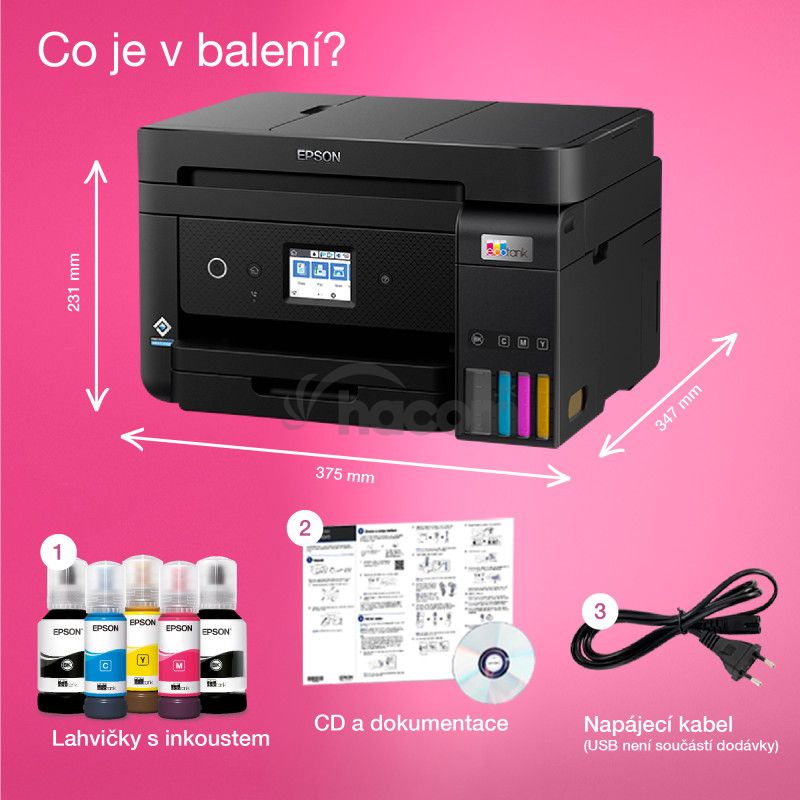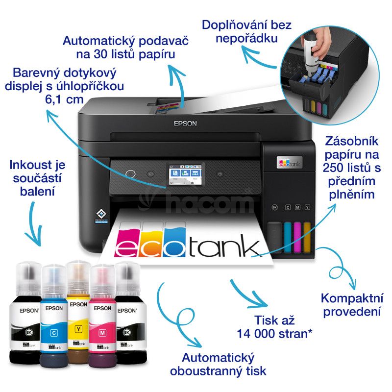 Ušetrite až 90 % nákladov na tlač¹ s tlačiarňami EcoTank od spoločnosti Epson bez atramentových kaziet. Integrované atramentové zásobníky, ktoré sa dodávajú s veľkokapacitnými fľašami s atramentom, sa vďaka špeciálne navrhnutým atramentovým fľašiam ľahko napĺňajú. Táto tlačiareň je ideálna pre každého, kto hľadá vysokokvalitné výtlačky s neuveriteľne nízkymi nákladmi na stranu, pretože nevyžaduje výmenu atramentových kaziet a navyše ponúka flexibilné funkcie pripojenia, fax a automatický podávač dokumentov.|