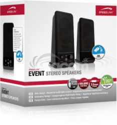 EVENT je sada reproduktorov 2.0, ktorá je ideálna pre všetky pracovné plochy. Vďaka kompaktnému rozmeru nezaberá príliš veľký prostor.Design poskytuje sade moderný vzhľad, ktorý je ideálny pre všetkých monitory s plochou obrazovkou. Napájeníreproduktorů je prostredníctvom USB kábla. Spolu s ovládaním hlasitosti má EVENT tiež 3,5 mm zástrčku pre slúchadlá, PC a MP3 prehrávač. Hlasitosť pripojených slúchadiel je možné nastaviť pomocou ovládania hlasitosti sady reproduktorov.technické údaje