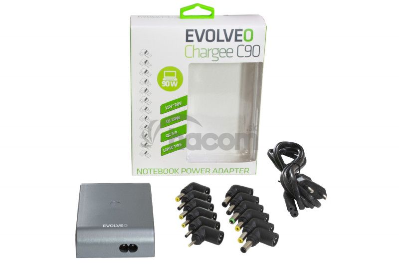 EVOLVEO Chargey C90 je kompaktný, prenosný adaptér s automatickým nastavením výstupného napätia od 15 do 20V podľa typu zvoleného konektora. Adaptér možno použiť aj pre bezdrôtové nabíjanie pre zariadenia s QI štandardom. Zdroj je dodávaný s 12 rôznymi konektormi, ktoré Vám umožní pripojiť väčšinu notebookov, ktoré sú momentálne v predaji. Maximálny výstupný výkon je 90W. Prídavný 5V USB port umožňuje nabíjať napríklad mobilné telefóny.Špecifikácia:
