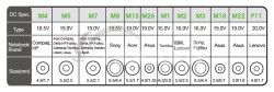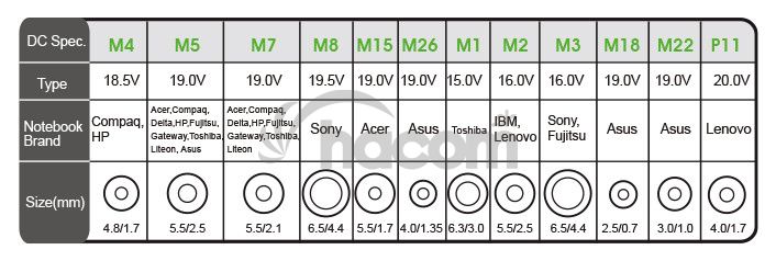 Vstupné napätie: AC 100-240V (50-60Hz) Výstupné napätie: DC 15-20V / max 90W USB port: 5V / 2.1A max • USB QC3.0 quick charging • 10W bezdrôtové nabíjanie • QI certifikácia • ochrana proti prepätiu • ochrana proti prehriatiu • prúdová ochrana • ochrana proti skratu • ochrana batérie notebooku pred nadmerným nabitím • súčasťou balenia je 12 konektorov pre rôzne typy notebookov • rozmery: 110 x 72 x 25mm TYP Výstup Veľkosť konektora Určené pre týchto výrobcov M1 15.0V 6.3 * 3.0mm Toshiba M2 16.0V 5.5 * 2.5mm IBM, Lenovo M3 16.0V 6.5 * 4.4mm Sony, Fujitsu M4 18.5V 4.8 * 1.7mm Compaq, HP M5 19.0V 5.5 * 2.5mm Acer, Compaq, Delta, HP, Fujitsu, Toshiba, Liteon , Asus M7 19.0V 5.5 * 2.1mm Acer, Compaq, Delta, HP, Fujitsu, Gateway, Toshiba, Liteon M8 19.5V 6.5 * 4.4mm Sony M15 19.0V 5.5 * 1.7mm Acer M18 19.0V 2,5 * 0,7mm Asus M22 19.0V 3.0 * 1.0mm Asus M26 19.0V 4.0 * 1.35mm Asus P11 20.0V 4.0 * 1.7mm Lenovo
