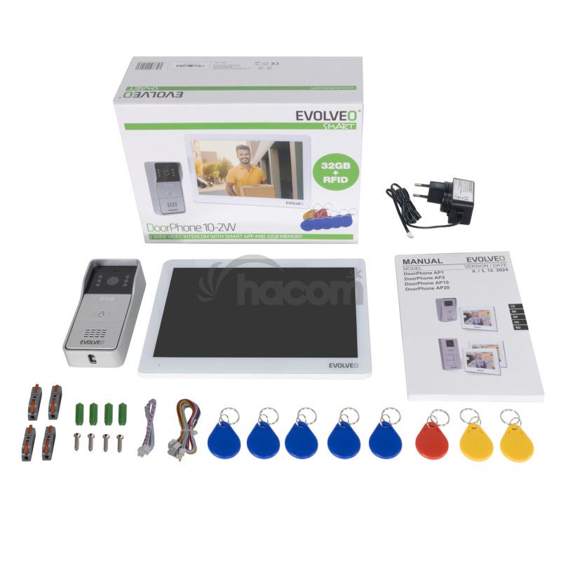 Balenie obsahuje všetko potrebné: vonkajšiu jednotku s kamerou a RFID čítačkou, vnútorný dotykový monitor s Wi-Fi, montážny materiál, napájací adaptér, prepojovacie káble aj základnú sadu RFID kariet . A samozrejme aj prehľadný návod na použitie . Máte tu skrátka k dispozícii všetko, čo na vytvorenie moderného a bezpečného vstupného systému do vášho domova potrebujete.