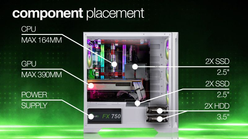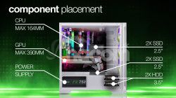 Vnútorný priestor tejto hernej počítačovej skrine je navrhnutý tak veľkoryso, že môže byť základom aj pre tie najambicióznejšie počítačové zostavy. Chladič procesora môže merať až 164 mm na výšku. Grafická karta sa sem zmestí v dĺžke až 390 mm . A pre ukladanie dát je k dispozícii miesto pre 2 klasické pevné disky (3,5") a 3 moderné rýchle SSD úložiská (2,5"). Každá hardvérová súčiastka je skrátka v tejto digitálnej pevnosti vítaným hosťom a dostane sa jej starostlivosť ako na cisárskom dvore. Úlohu pritom nehrá ani jej urodzený pôvod – do skrine sa dajú vložiť základné dosky Intel aj AMD , pričom sú podporované formáty ATX, eATX (Extended ATX), mATX (Micro ATX) aj mITX (mini ITX).