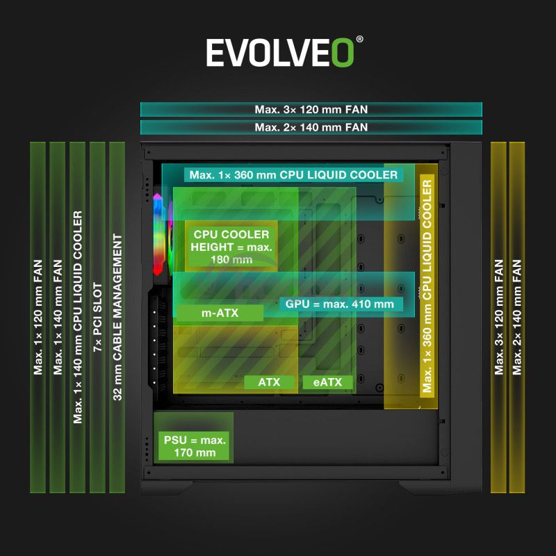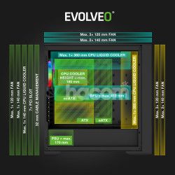 V počítačovej skrini EVOLVEO Rhino-BK-4 je dostatok miesta na všetko, čo má nadupaná herná mašina mať. Zmestí sa sem až 415mm grafická karta, chladič procesora s výškou až 180 mm aj všetky potrebné disky – v skrini sú 4 pozície pre 3,5" HDD a 5 slotov pre 2,5" SSD . Nič vám tak nebráni zostaviť si počítač, ktorého hardvér hrá prvú ligu.