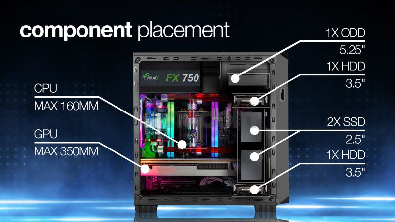 Skriňa Shaw 2 je pripravená na umiestnenie 2x 3,5 "a 2x 2,5" diskov, ďalej je tu pozícia pre 1x 5,25 "DVD mechaniku. Do skrine je možné umiestniť grafickej karty o maximálnej dĺžke 350mm, čo pokrýva všetky herné grafické karty na trhu. Maximálna výška chladiča je 160mm.