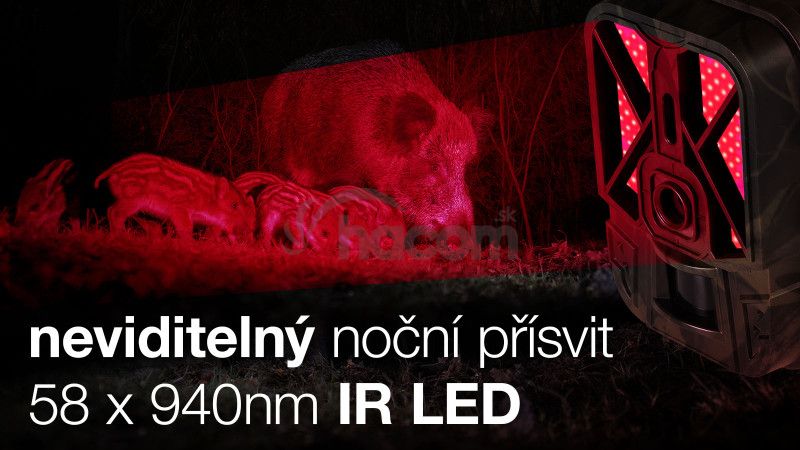 Infra nočný prísvit je dôležitá funkcia každej fotopasce, vďaka 940nm LED diódam je možné zariadenie použiť nielen na sledovanie zveri, ale aj na stráženie objektov, kedy narušiteľ nie je schopný v noci tento typ prísvitu pozorovať, na rozdiel od 850nm technológie. Vďaka 58 IR LED diódam s 940nm technológiou dôjde k veľmi dobrému osvetleniu nočnej scény.