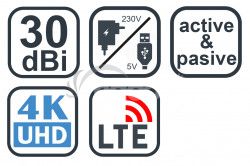 Izbová anténa pre príjem digitálnej aj analógovej TV. Zosilňovač antény je možné napájať vďaka USB káblu dvoma spôsobmi. Napájanie pomocou adaptéra 230V a ďalej napájanie z USB konektora. Druhý spôsob ocení užívateľ, ktorý chce sledovať TV napr. Na NB pomocou USB tuneru.Špecifikácia: