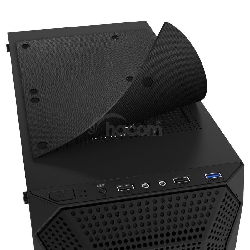 Na prednej strane skrine nájdete všestranné ovládacie centrum s vypínačom ON/OFF, tlačidlom ARGB podsvietenia a signalizačnými diódami informujúcimi o zapnutí počítača a prevádzke systémového disku. Ďalej tu máte k dispozícii rýchly port USB 3.0 , dve zdierky klasického rozhrania USB 2.0 a audio jacky pre sluchátka a mikrofón. Všetko pekne po ruke a pripravené na akciu.