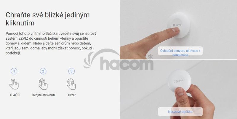 T3C Smart Button - Vyžaduje použitie s EZVIZ Home Gateway A3Okrem aplikácií alebo hlasového ovládania môžete teraz pomocou tohto jednoduchého šikovného tlačidla zapínať a vypínať celý senzorový systém EZVIZ alebo ho stlačením odoslať núdzový poplach. Má malú veľkosť a je napájaný batériami.
