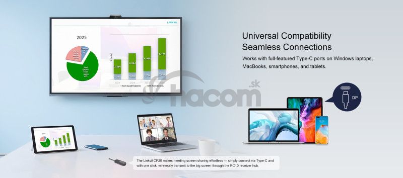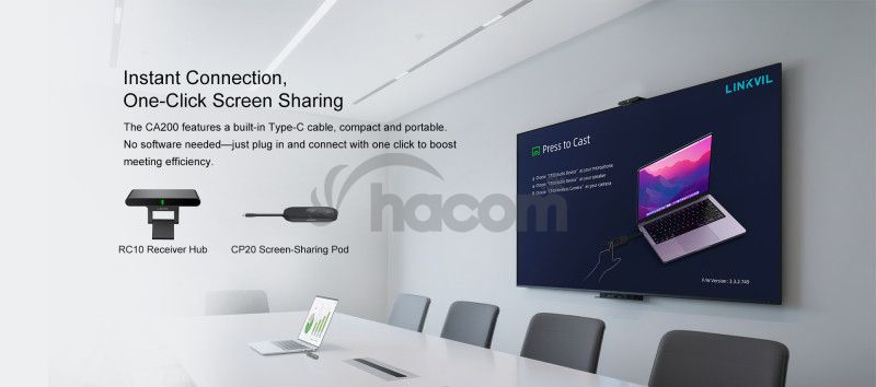 Linkvil CA200 je bezdrôtová konferenčná sada navrhnutá pre zjednodušenie nasadenia a zvýšenie efektivity schôdzok. Vďaka integrovanému vysielaču a prijímaču môže jeden rozbočovač CA200 súčasne pripojiť až štyri pody na zdieľanie obrazovky CP20 – nie je nutná žiadna systémová integrácia. Stačí ho zapojiť a môžete začať s ním pracovať. Podporuje bezdrôtové vysielanie v rozlíšení 4K a umožňuje bezproblémové prepínanie do režimu zmrazenia, čo umožňuje plynulú prezentáciu a flexibilnú spoluprácu v rôznych scenároch. CA200 je kompaktná a prenosná, kompatibilná s viacerými zariadeniami, čo pomáha eliminovať neporiadok s káblami a vytvoriť čistejšie a produktívnejšie prostredie pre schôdzky.Okamžité pripojenie, zdieľanie obrazovky jedným kliknutím