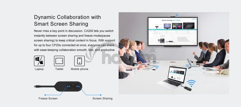 Nikdy nezmeškajte žiadny dôležitý bod diskusie. CA200 vám umožňuje okamžite prepínať medzi zdieľaním obrazovky a režimom zmrazenia (pozastavenie zdieľania obrazovky), aby ste sa mohli sústrediť na dôležité obsahy. Vďaka podpore až štyroch pripojených zariadení CP20 naraz môže každý ľahko zdieľať svoje obsahy, čo zaisťuje plynulú, rýchlu a produktívnu spoluprácu.