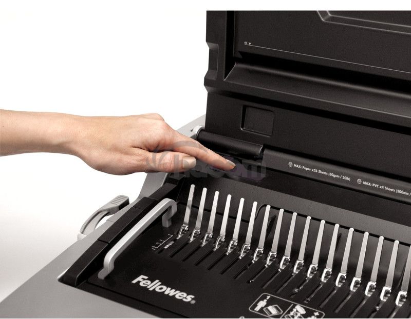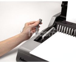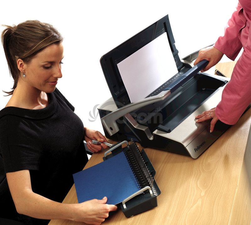 Jedinečné prevedenie robustného viazacieho stroja s užívateľsky samostatne prevádzkovanou viazacou jednotkou ponúka elektrický model Fellowes Galaxy E. Dierovacia kapacita až 28 listov 80g papiera. Kapacita väzby až 510 listov (do priemeru chrbta 51 mm). Možnosť nastavenia vzdialenosti dier od okraja zväzku. Vyraditeľné perforačné nože (pre formát A5).Veľký odpadový šuplík s možnosťou uloženia plastových chrbtov. Integrovaná mierka pre správnu voľbu priemeru chrbta. Na čelnej strane stroja je priezor pre ľahkú kontrolu zaplnenia odpadového priestoru.