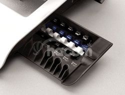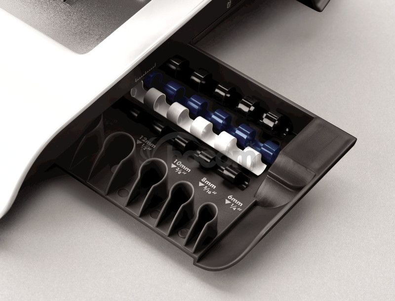 Stroj je vybavený zásobníkom na uloženie niekoľkých plastových chrbtov a integrovanou mierkou pre správnu voľbu priemeru chrbta. Na čelnej strane stroja je priezor pre ľahkú kontrolu zaplnenia odpadového priestoru.