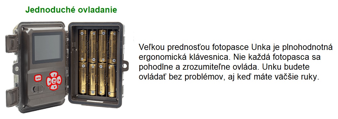 Obrovskou výhodou fotopasce Unka je slovenské menu a intuitívne ovládanie. Vďaka nemu vám nastavenie fotopasce a jej uvedenie do plnej prevádzky nezaberie viac ako pár sekúnd. Vyvolanie fotky je tak rýchle že oproti iným fotopascam dokáže spraviť viac fotiek za 1s.