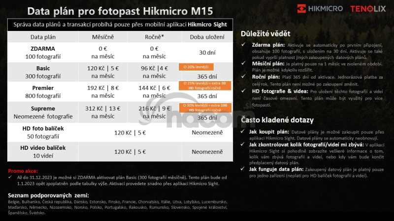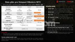Fotopasca má zabudovanú SIM kartu, ktorá funguje v Českej republike a na Slovensku ihneď po kúpe a nie je potrebné si ju predplatiť. Spoplatnené je len sťahovanie fotografií a videí zhotovených prostredníctvom aplikácie HIKMICRO Sight. Základný plán 100 fotografií mesačne je ZDARMA. Prehľad data plánov nájdete TU.