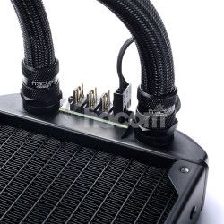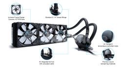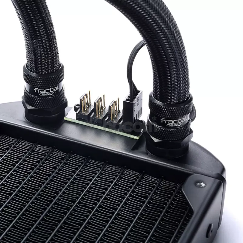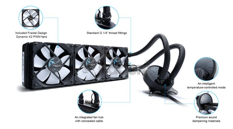Výkonná vodná pumpa s keramickým ložiskom je opatrená medenou kontaktnou plochou pre dokonalý odvod tepla z procesora. Chladiaca kvapalina tak môže pretekať úplne optimálne a vy tak získate maximálny výkon chladenia. Inteligentná kontrola rýchlosti umožňuje využívať 2 módy. Pri automatickom sa rýchlosť vetrákov a čerpadlá riadi samostatne podľa teploty a v režime PWM si užívateľ nastaví všetko podľa vlastného uváženia. 403mm radiátor je osadený dvoma 120mm ventilátormi Fractal Design Dynamic X2 GP-12 PWM s rýchlosťou až 2 000 otáčok za minútu.
