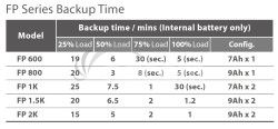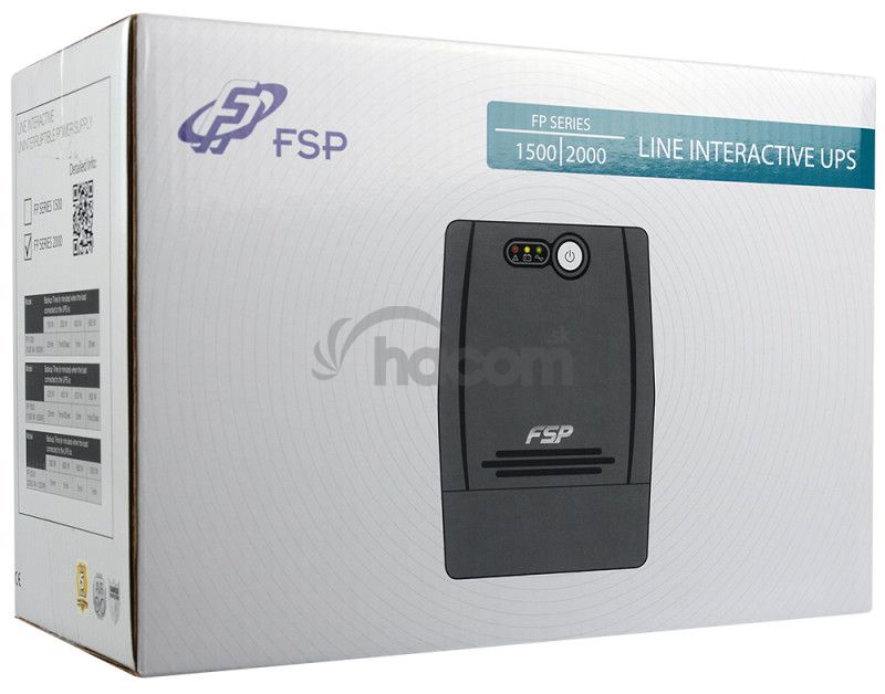 UPS zdroj slúži ako záložná batéria, ktorá udrží počítače, servery a inú IT techniku v chode pri výpadku elektrického prúdu. Prednosti tohto modelu sú predovšetkým jeho kompaktné rozmery, vysoká spoľahlivosť zaručená kvalitným mikroprocesorom, odolnosť voči automatickému vypnutiu, nabíjanie i v off-režime a funkcia studeného štartu.FP séria UPS FSP / Fortron nemá možnosť komunikácie s PC (nie je obsiahnutý USB ani RS-232 komunikačný port). V prípade požiadavky na komunikačný port použite UPS z radu EP série.