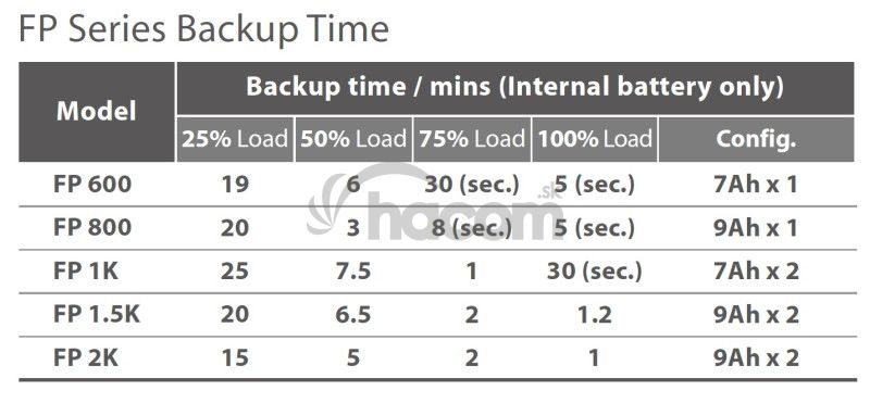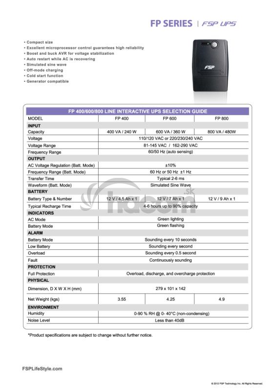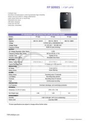 UPS zdroj slúži ako záložná batéria, ktorá udrží počítače, servery a inú IT techniku v chode pri výpadku elektrického prúdu. Prednosti tohto modelu sú predovšetkým jeho kompaktné rozmery, vysoká spoľahlivosť zaručená kvalitným mikroprocesorom, odolnosť voči automatickému vypnutiu, nabíjanie i v off-režime a funkcia studeného štartu.FP séria UPS FSP / Fortron nemá možnosť komunikácie s PC (nie je obsiahnutý USB ani RS-232 komunikačný port). V prípade požiadavky na komunikačný port použite UPS z radu EP série.