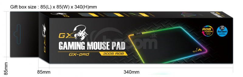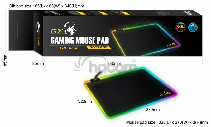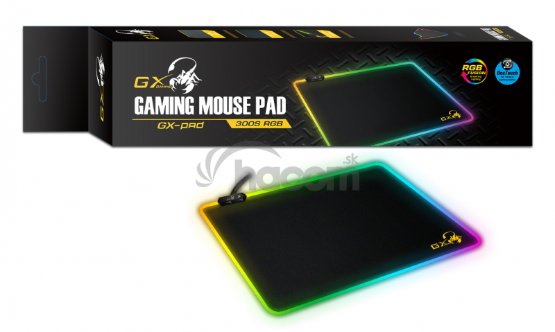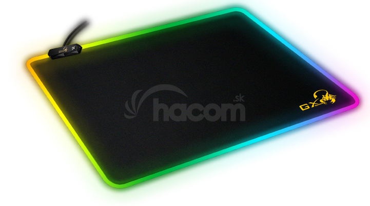 Genius podložka pod myš RGB GX-Pad 300SHerná podložka pod myš s RGB podsvietením, hladký textilný povrch, stvorená pre hladký sklz myši a vysokú presnosť, vhodná pre optické a laserové myši, rozmery 320 x 270 x 3 mm, hmotnosť 163 g, dĺžka kábla 1,8 m
