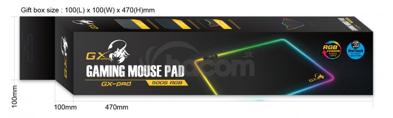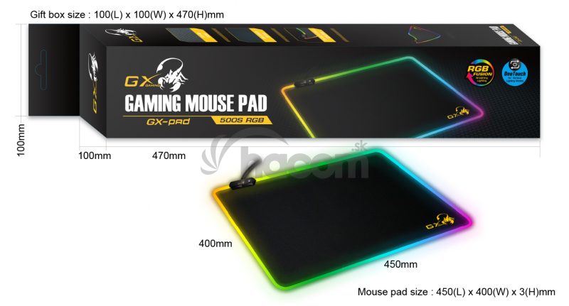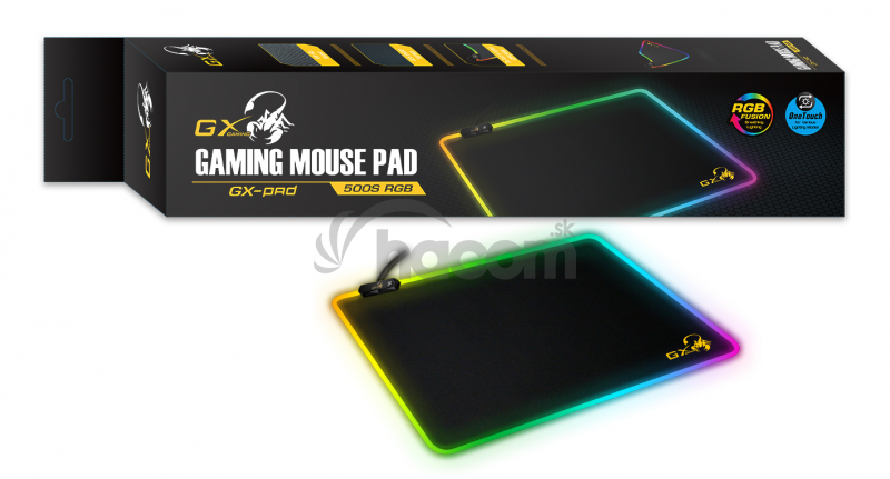 Genius podložka pod myš RGB GX-Pad 500SHerná podložka pod myš s RGB podsvietením, hladký textilný povrch, stvorená pre hladký sklz myši a vysokú presnosť, vhodná pre optické a laserové myši, rozmery 450 x 400 x 3 mm, hmotnosť 317 g, dĺžka kábla 1,8 m