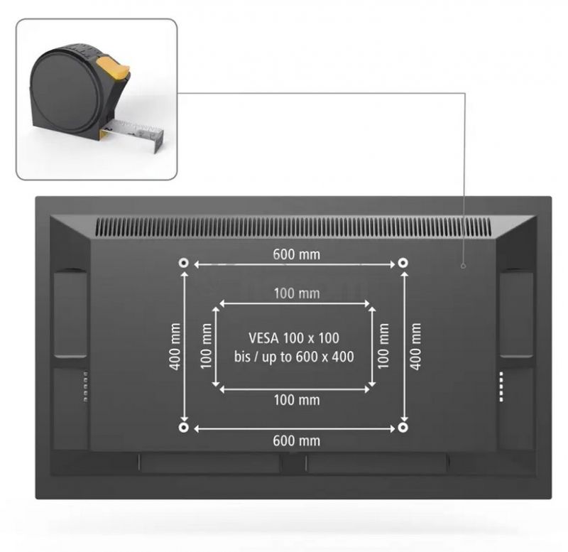 | VESA štandard | 100x100 | 100x150 | 100x200 | 200 x 200 cm | 200x100 | 200x300 | 300x100 | 300x200 | 300x300 | 300x400 | 400x200 | 400x300 | 400x400 | 500x400 | 600x200 | 600x300 | 600x400 |