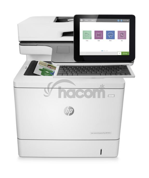 Tlačiareň HP Color LaserJet Enterprise Flow MFP M578c; Štyri predinštalované tonerové kazety HP LaserJet (výťažnosť 5 500 strán čiernobielo a 3 500 strán kombinovane - azúrová, purpurová, žltá); Zberná nádobka tonera; Priložená dokumentácia; Napájací kábel; faxový kábel