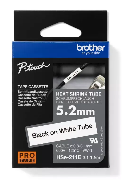Originálna kazeta s tepelne zmršťovacou trubičkou Brother HSe-211 - čierna tlač na biele, šírka 5,8 mmOriginálna tepelne zmršťovacia trubička Brother HSe-211 so šírkou 5,8 mm je určená špeciálne pre trvalé značenie a identifikáciu káblov a vodičov.