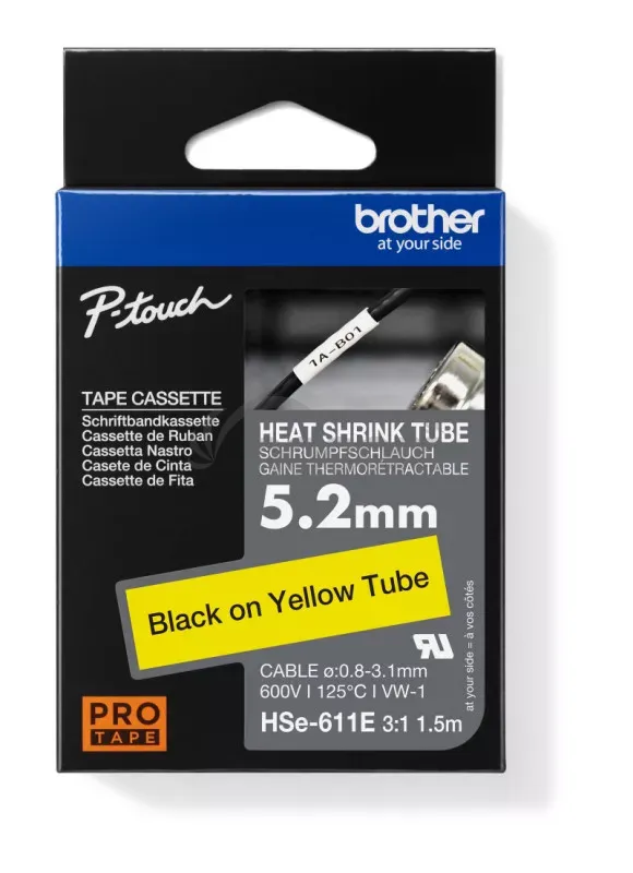 Originálna kazeta s tepelne zmršťovacou trubičkou Brother HSe-611E - čierna tlač na žltej, šírka 5.2 mm*https://www.brother.ee/supplies/p-touch/tapes/hse/hse611e