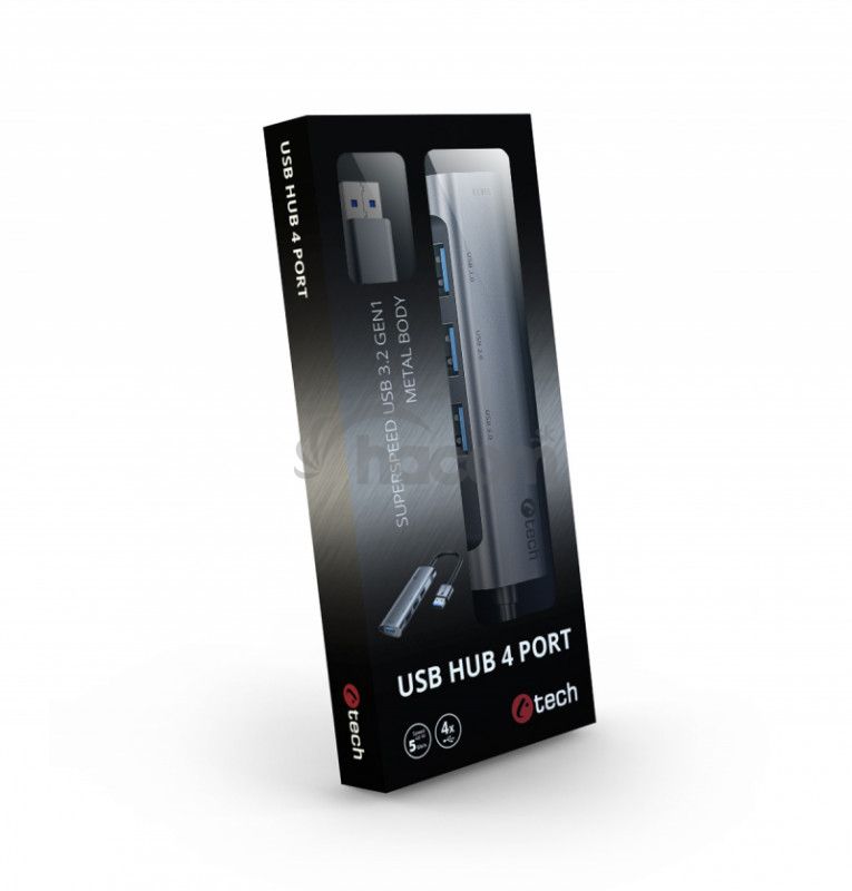 C-tech UHB-U3-AL je kompaktný USB hub s ľahkou a odolnou hliníkovou konštrukciou. Je vybavený 4 portami s rozhraním USB 3.2 Gen1. a maximálnou prenosovou rýchlosťou až 5Gb/s (10× rýchlejšia ako USB 2.0). Je ideálnym riešením na rozšírenie dostupných USB portov pre notebooky, ultrabooky a ostatné zariadenia s obmedzeným počtom USB portov. Veľmi jednoducho tak svoje zariadenie rozšírite o ďalšie periférie ako sú myši, USB dátové úložiská, externé disky. Hub podporuje technológiu Plug & Play, takže stačí ho pripojiť k zariadeniu a počkať na automatickú doinštalovanie východiskových ovládačov bez potreby zvláštnych ovládačov.Špecifikácia: