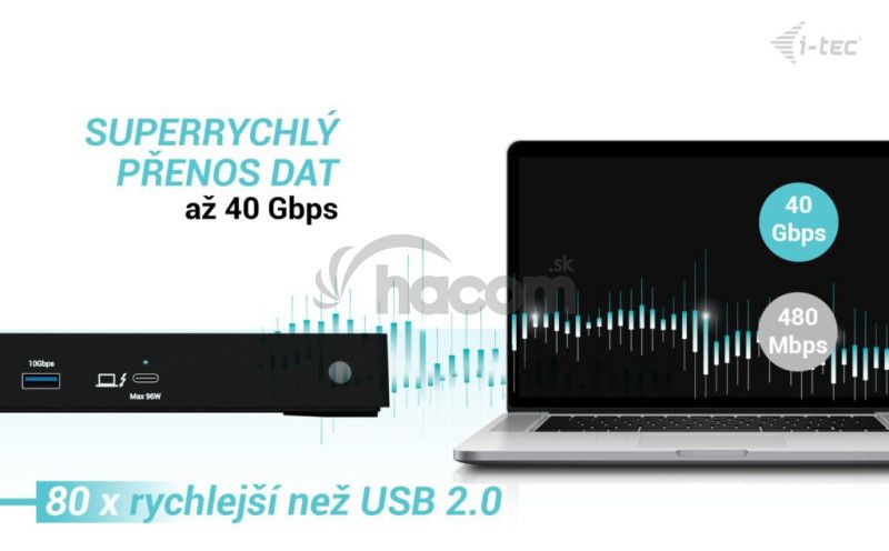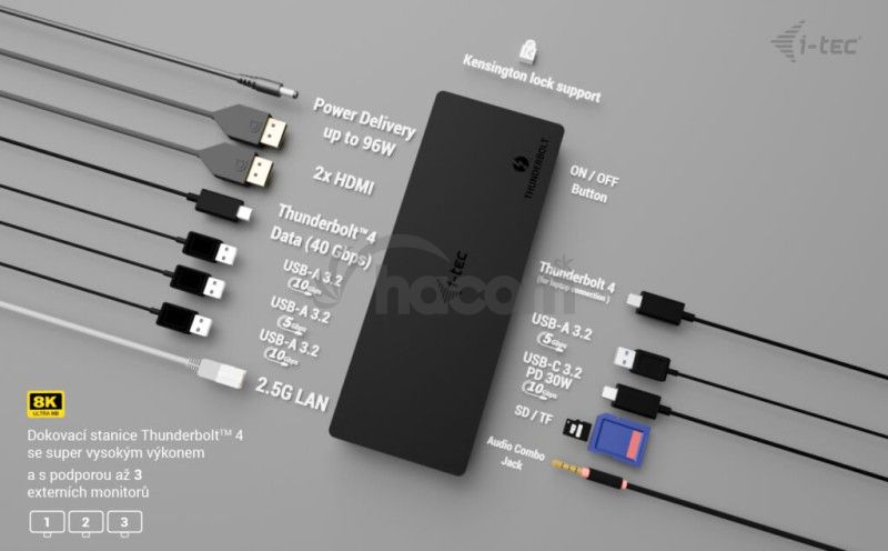 Ultra vysoký výkon, ultrarýchly prenos dát a podpora rozlíšenia až 8K/60 Hz. Jedna z najvýkonnejších dokovacích staníc i-tec na trhu!Krištáľovo čistý obraz, superrýchly internet a možnosť prenášať dáta rýchlosťou až 4 GB za sekundu vďaka integrovanému výstupnému portu Thunderbolt 4. Môžete tiež samozrejme pripojiť slúchadlá alebo audio a nabíjať notebook (96 W), a to všetko pomocou jediného kábla (100 cm certifikovaný Thunderbolt 4 kábel je súčasťou balenia).