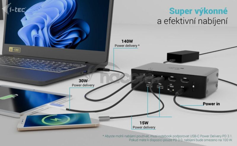 • *Ak váš notebook alebo tablet podporuje nový a moderný nabíjací protokol USB-C Power Delivery PD 3.1, dokovacia stanica ponúkne nabíjací výkon až 140 W (ak máte PD 3.0, nabíjací výkon bude 100 W).