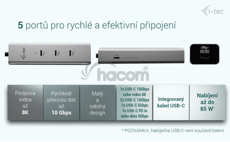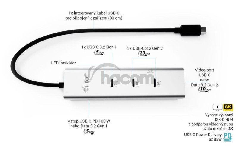 - i-tec USB-C Charging HUB 5port s USB-C video 8K, Power Delivery 85W C31HUBMETAL8KPDPRO